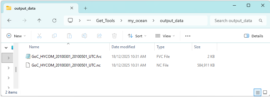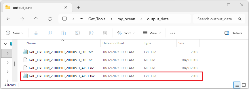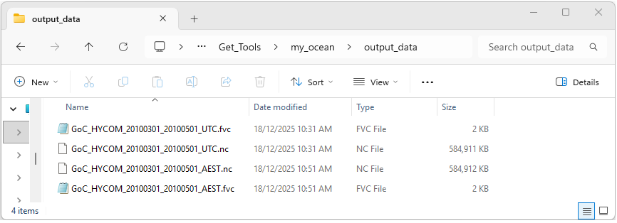 If the program has run as expected there should be two new files GoC_HYCOM_20100301_20100501_AEST.nc and GoC_HYCOM_20100301_20100501_AEST.fvc within the output_data directory as shown below.