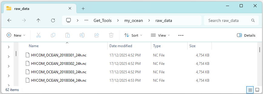 The downloaded HYCOM files should appear in your specified output directory as shown below. Note: each file name includes the model name, date (YYYYMMDD) and timestep (in hours). As no timestep was defined in the arguments above the default timestep of 24 hours was used.