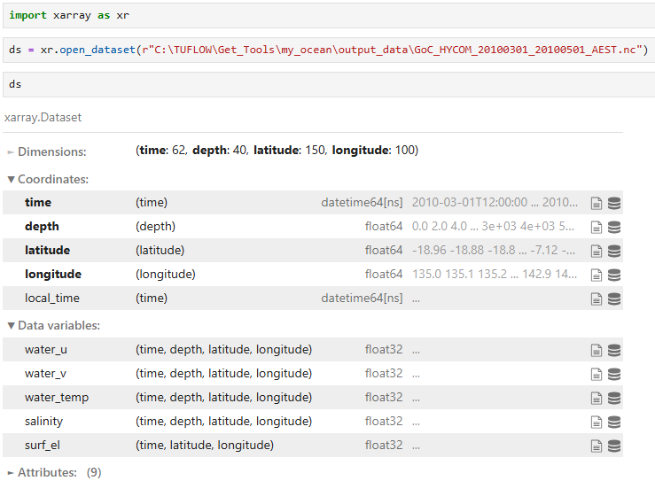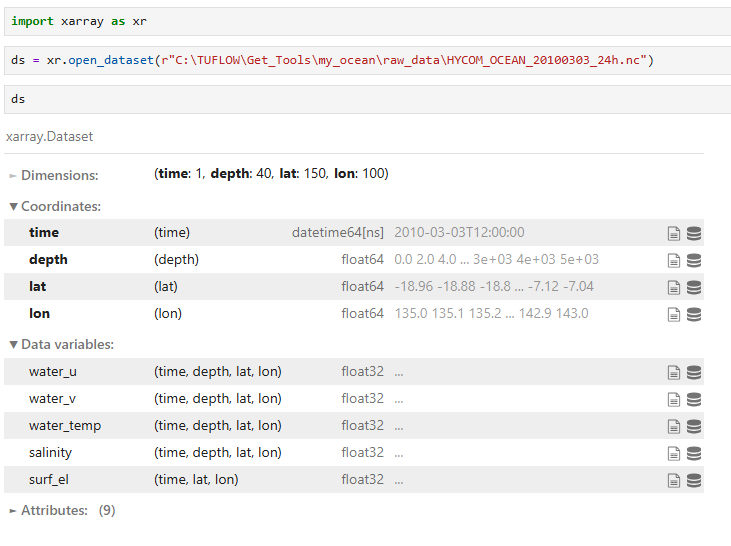 Raw files are saved in NetCDF format and can be opened with viewers that support NetCDF4. The example below shows the structure and properties of HYCOM_OCEAN_20100303_24h.nc using Python (which can be installed with the TUFLOW FV Python Toolbox):