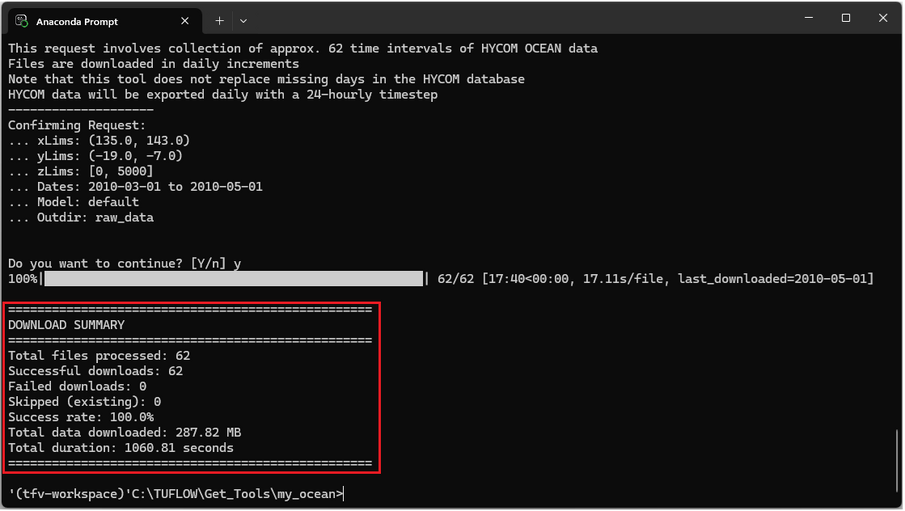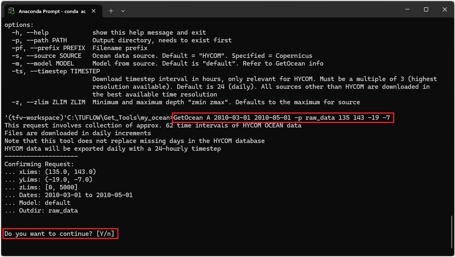 Note: the download may take a long time. Therefore users are encouraged to run Get Ocean A overnight particularly when requesting high temporal resolution data or data covering long time frames. To save time you may have up to 2-concurrent connections to the HYCOM server per IP address so you may run this program twice. For example, if you are collecting data across two years you could use two separate conda windows to concurrently download the first and second year. Be careful that you are not using a shared PC when running this program - you don't want to lock yourself or others out of the HYCOM server.