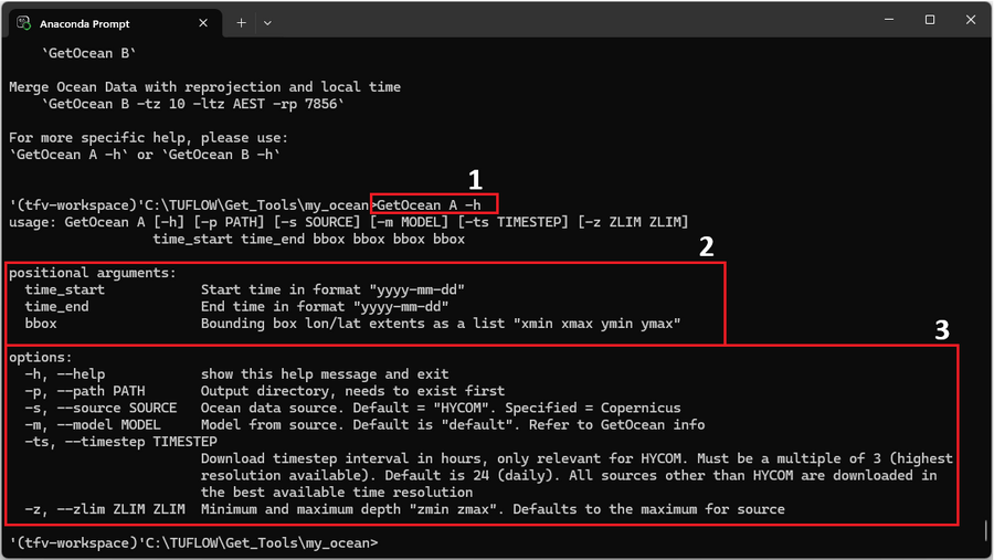 The output shows a number of required positional arguments (red box '2') and run options (red box '3'). Positional arguments are required and must be provided in order: time_start and time_end to define the date range and bbox to define the spatial extent as longitude or latitude bounds. Optional arguments can be included as needed.