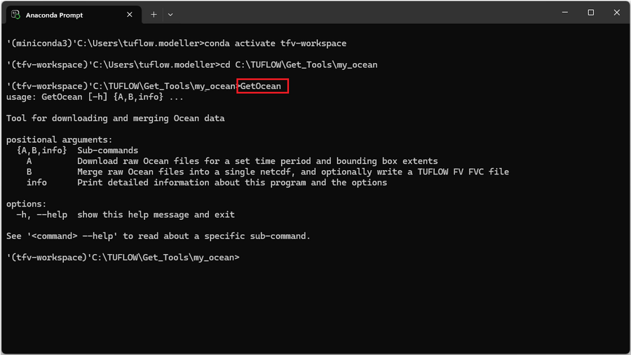 - Guidance on how to access detailed help for specific sub-commands (using GetOcean A -h or GetOcean B -h).