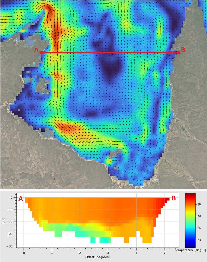 The NetCDF file created using the tfv Python module can be opened in QGIS using the TUFLOW Viewer Plugin to view the data variables as map outputs. In the figure below the upper plan view shows surface velocity and the bottom image a 3D temperature long section between Point A and Point B. Note: the region of cooler water underlaying the warmer surface water between chainages 1 and 3 degrees of longitude. For guidance on plotting in QGIS using the TUFLOW Viewer Plugin visit: Viewing 3D TUFLOW FV Results in QGIS.