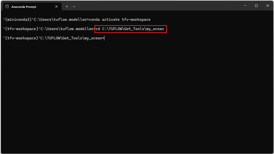 - 2. Navigate to your preferred working directory. In this example, the working directory is set to C:\TUFLOW\Get_Tools\my_ocean.
